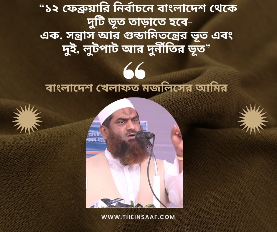 বাংলাদেশ খেলাফত মজলিসের আমির বলেছেন ১২ ফেব্রুয়ারি নির্বাচনে বাংলাদেশ থেকে দুটি ভূত তাড়াতে হবে- এক, সন্ত্রাস আর গুন্ডামিতন্ত্রের ভূত এবং দুই, লুটপাট আর দুর্নীতির ভূত।